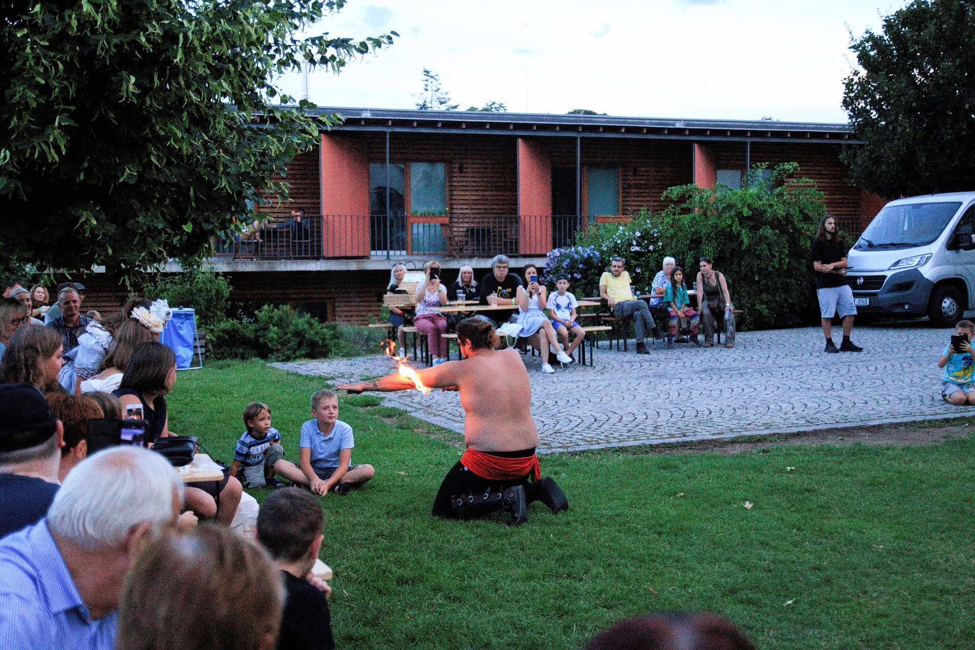 Na zámeckém nádvoří jsme se do dávné historie přenesli díky krásným baladám u cimbálu v podání cimbalistky Terezky, zpěvaček Adélky a Magdalenky z Vrbice. Při tónech cimbálu se sluníčko schovalo za budovu a v příjemném podvečeru jsme se s hradrockovou kapelou Quanti Minoris a Skupinou historickém šermu Albion ocitli v období středověku. Slovy nelze popsat propojení hudby (gemshorn, křivý roh, zobcové flétny, píšťala s měchuřinou, chalumeaux, příčná flétna, loutna), zpěvu a šermířsko-ohňové show. Quanti Minoris a Albion vytvořili nádhernou atmosféru, při které se tajil dech. Nepopsatelná, mystická atmosféra, netypické melodie.
